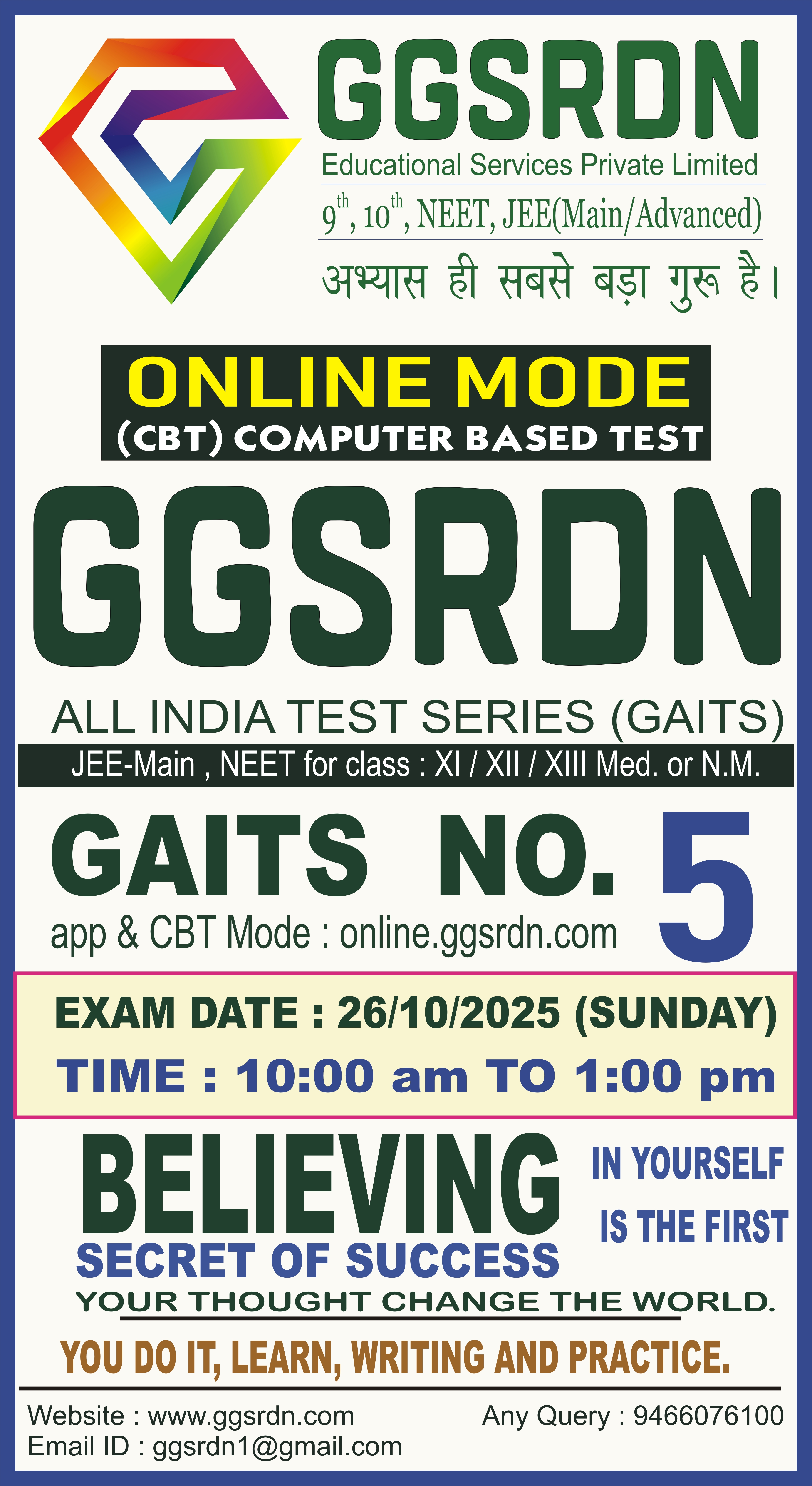 GGSRDN conduct Test Series for JEE (Main / Advanced) & NEET (UG) which is also available in postal mode. The Test Series for JEE (Main / Advanced) includes Schedule & Syllabus and Question Papers. GGSRDN have been designed keeping in mind the ease of learning for students.
